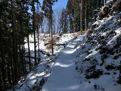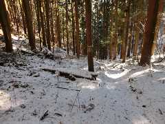 昼食も済み十分休憩も出来たので小仏峠を目指して降る事にする。陽当たりの良い斜面は雪が解けて流れ出しているが日影の所は程よく新雪が有りアイゼン無でも快適に歩ける