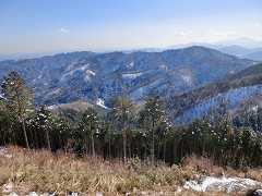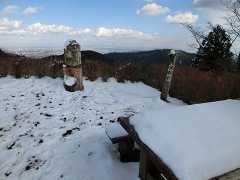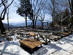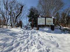 急斜面の植林帯の中をジグザグに登り頭上が明るく開けてきて景信山山頂直下の陣馬高尾縦走路に出る。此処で初めて一人の登山者の姿が見える。最後の急坂を登り詰めて景信山山頂に到着。15センチほどの積雪があり昨日降った新雪なので真っ白で気分は爽快。