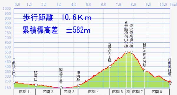 日影沢入口P→蛇滝口→小仏川遊歩道→国道20号→清滝駅→6号路→5号路→逆沢作業道→日影沢→日影沢入口P