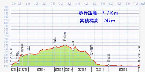 サマーランドP→登山口→尾根道→雹留山→車道→新山田際→引田橋→サマーランドP⇒裏高尾