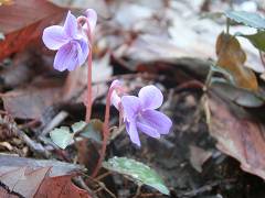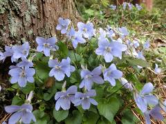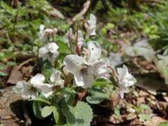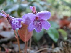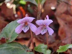 尾根筋(秋川丘陵コース)を網代弁天山方面に向かう。途中竹林を通過して小さな社も通過して行く。至る所に枝道が有るが標識に従って行くと明るい雑木林となり目的のスミレが100m程の間に点々と咲いている。初めて来た所なので引き返さず先に進み地図に山名の表記されている雹留山268mを通過して車道に出て新山田橋の際から秋川に下り川沿いにサマーランドの駐車場所に戻る。