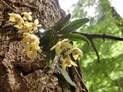 ゴールデンウィークの最終日6号路から一丁平まで歩く。Fさんと足下に咲く花を探索しながら超スローペースで歩いてる為、後から登って来る人にどんどん追い越されて行く。「犬もあるけが棒に当たる」...”天から降って来たカヤランに当たる”足下のカヤランを撮影後近くの大木に取り付けて無事成長する事を願う。