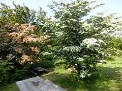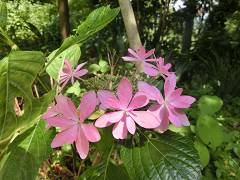 一丁平のヤマボウシの花の謎?..咲き始めは白色で次第にピンク色に変わってくる。時期に寄って色が変わる事が明確になる。下記左の写真2枚参照。伐採されて明るくなった萩原作業道を下り日影沢林道に出て戻る。