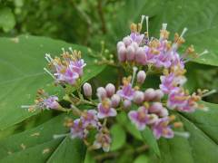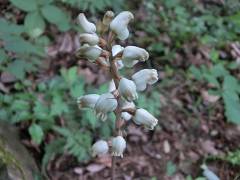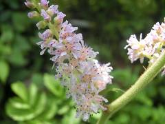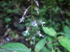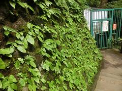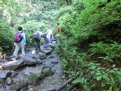 霞台で水分補給の小休止後、蛇滝に降る。急斜面をジグザグに降り膝のコントロールが乱れてくる。岩壁に密集したイワタバコの脇を下り蛇滝を左に見ながら降り車道に出る。小仏川(蛇滝口)まで車道を降り久し振りに小仏川遊歩道を通って高尾駅まで歩く。