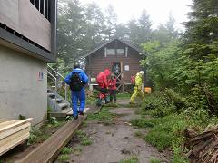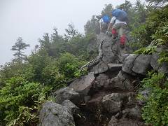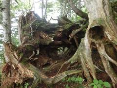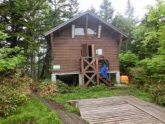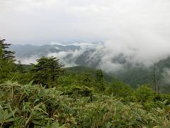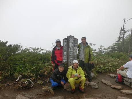 灰色の雲のベールで展望は無く記念撮影後引き返す。雨で足元がドロドロの所が有りスリップにも気を付けて弘法大師堂避難小屋の戻ると雨を避けて小屋内での昼食休憩の登山者で満員。幸いに雨は上がっていたので外のベンチで行動食を食べながら小休止。弘法大師堂避難小屋発(13:00)天気は回復の方向のようだが雨具を見に付けたまま行く。
