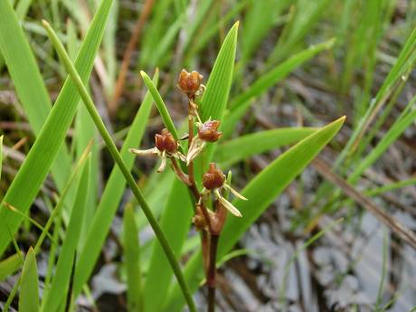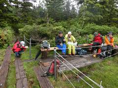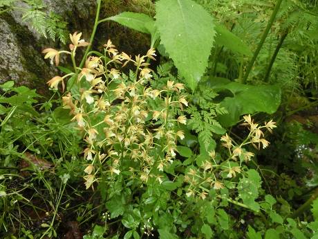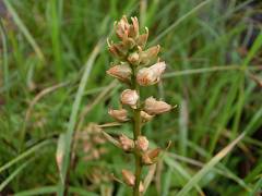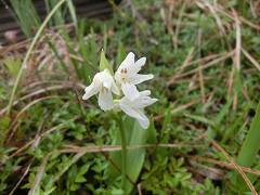 田代湿原の木道を右回(南側)りで往路の分岐点まで戻る。途中はコバイケイソウと雨に濡れたワタスゲの白い花が多く見れれる一筋の木道を辿る。諦めていたトキソウ、最後の最後でYAさんが一株だけ咲いている花を見つけて写真に収める事が出来る。時期の関係でサワランは見られなかったが予想外の見頃のコケイランを見られて曇り空でも大変満足できる山歩きが出来る。14:50猿倉登山口に戻る。