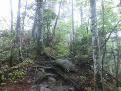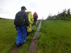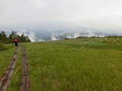 一時雨が降って来たので雨具を着ての登山になるが直ぐに止み小田代の湿原、標高1820m(8:20)に出た時は雨具が不要になるが次の雨雲に備えて行く。前方に目指す田代山が目前に迫って来る。樹林帯の中に入って急斜面の登山道を登り詰めると空が開けて田代湿原の東の一角に出る(8:50)
