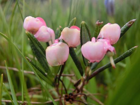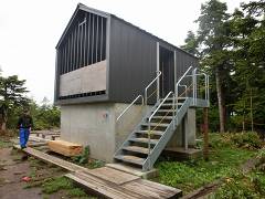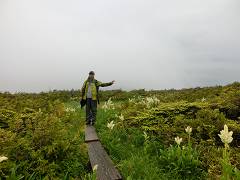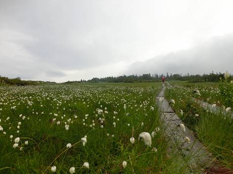 広々とした高層湿原を気持ちよく木道に従って歩いて行く。青空で陽が出たら最高の環境だが!この時期欲張りな考えだ、雨が降らないだけ幸いだ。足下に咲く小さな植物など見ながらワタスゲの草原を気分よく歩いて行く。湿原の西の端にベンチが有り此処で景色を眺めながら早い昼食にする(9:30)林の中に弘法大師堂避難小屋と綺麗なトイレ舎が有り当初、此処での昼食を予定していたが。
