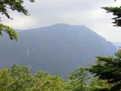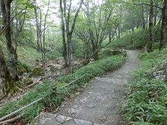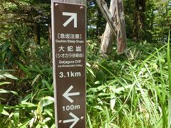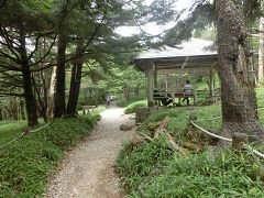 本日の最高地点、日出ケ岳ヘあと標高差50mの登りで急斜面をゆっくり登って行き標高1695mの山頂に登り付く。山頂には屋上展望台が有る休憩舎が有り雷除けの避雷針が4本設置されている。生憎雲が多くなって来て展望は無く雷鳴が聞こえて来たので早々に引き返す。分岐点からはコンクリートの石段を降って行き平坦な山道となりビジタセンターの脇に出る(15:45)。明日の入山認定書をビジタセンターで受取16時からのレクチャーを受講する。心・湯治館(泊)