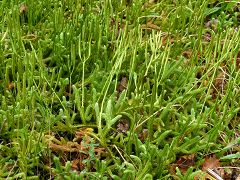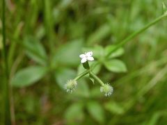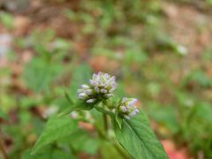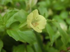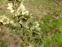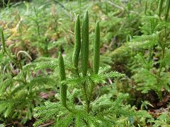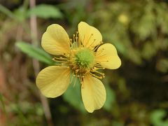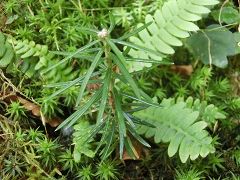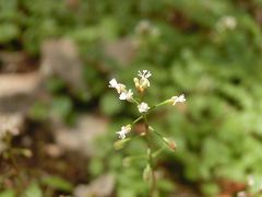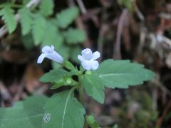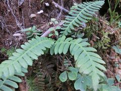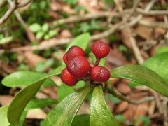 中ノ沢の上流部を渡り小高い所を越えて行くとミヤマシキミが群生しているが花や実は殆ど見られず開拓地跡地に降って行くと再び5匹程の鳥が走って行く。ヤマドリの様だ。茶色のトイレが設置されている所を過ぎてきれいな水が流れる沢を渡り(橋は無く石伝い渡る)開拓地跡を行くと展望所の分岐が有り(開拓地跡分岐)此処で小休止していると時計回りで来られた若い男女が展望所に登って行く。