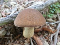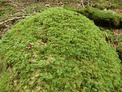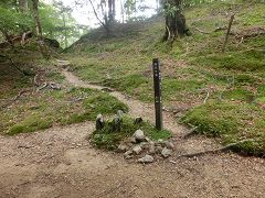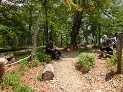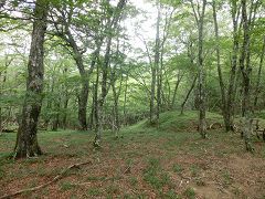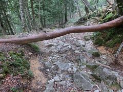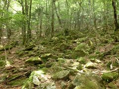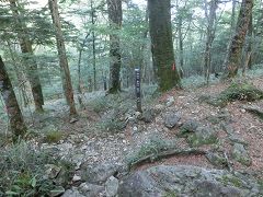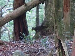 標高差100m程のガレ場の登りが続く。ゆっくりとスローペースで確実に行く。登りつめた所の左手の木の根や草で覆われた中から黒い小さな鳥(ミソサザエ?)が十数羽飛び出してくる。巣が有る様だ。近くの倒木に腰を降ろして小休止する。この後はしばらく平行移動が続き若い女性二人行き交い猪が直ぐ近くに居た話を聞き注意深く歩いて行くが姿は見られなかった。