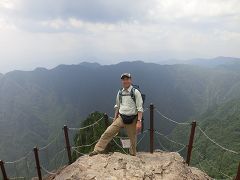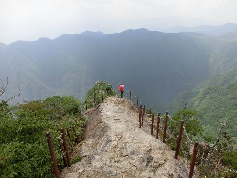 尾根を登り詰めた三叉路(大蛇ーの分岐点)の木陰で多くの登山者が休憩している。小休止したい所だが緩やかに下って行き大蛇ーに向かう。直ぐに露岩の痩せ尾根となり周りの深い谷に突き出た岩(大蛇ー)に出る。写真では平坦に見えるが降り勾配で慎重に先端まで行く。大峰山の山々、足元は深い谷で大台一の絶景ポイントだ。