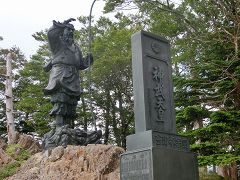三叉路に戻り水分補給と小休止後、日出ケ岳に向かう。此処からは笹原の大きく開けた草原状の中を行く。牛石ケ原(牛が寝ている姿の岩が有る)を行くと左手に八咫烏と神武天皇の大きな像が建っている(神武東征の再現)。緩やかに下って行くと休憩舎のある尾鷲辻で大台ケ原Pに降る枝道が有る。