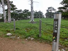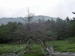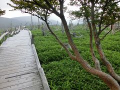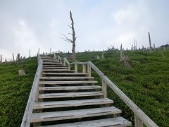 尾鷲辻から日出ケ岳に向かう登山道も笹原の緩やかな登りで立ち枯れの木が多く草原状態が続く。正木が原を通過して正木峠辺りから木製の幅の広い階段を登って行き途中の休憩用ベンチで小休止。此の辺りも遮る物が無く幸い雲が出てきて直射日光は避けられる。正木嶺(1680m)を木製の階段で越えて五葉躑躅(シロヤシオ)群生する中を降り大台ケ原Pと日出ケ岳の分岐点に降る。。
