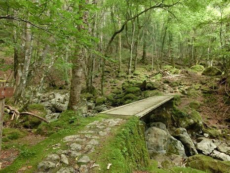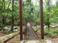 普通、登山は登山口から高い所を目指して登って行くのだが今回は初めは谷に降って行くのだ(時計回りのコースを選べば初めは日出ケ岳目指しての登りとなる。)降り切ったシオカラ谷を吊橋で渡り此処からが登りとなる。沢を吹き上げて来る涼風は無く汗がにじみ出るが新鮮な緑の木陰道は救われる。