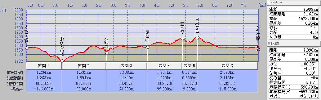 西大台ケ原 大台ケ原P →ゲート→ナゴヤ谷→七つ池→開拓地跡地→展望所→中ノ谷橋→ゲート→大台ケ原P