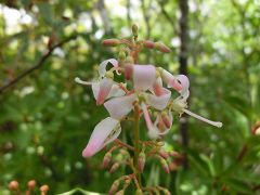 下山途中で目的の花の一つビランジも終盤だが見る事が出来て目標達成。更にウメガサソウ、ヒキヨモギ、フシグロ等も見る事が出来て自然と身も心も軽くなる。茅が岳尾根コースの登山口(林道)に降り往路の登山口まで林道を歩き往路を速足で戻り帰りのバスに飛び乗る。今回お誘い頂いたOさんの案内で予想外の多くの花を見る事が出来改めて感謝!!