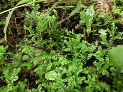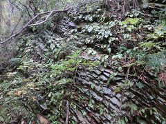 足下にはクラマゴケの絨緞が続き、岩壁にはイワタバコの一枚葉がたくさん張り付いて見える。400m程行くと林道の終点で五条の滝の案内標識が有り、此処から山道の登りとなる。