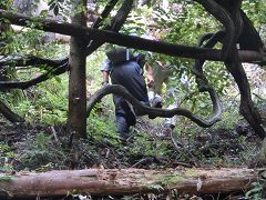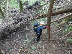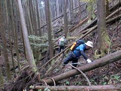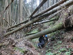 倒木を迂回したり、乗り越えたり、潜ったり、倒木の間を通り抜けたりし、この倒木の所を通過するのに予想外の体力を浪費する。