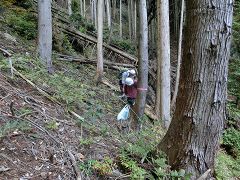 密集する植林帯を降る |
