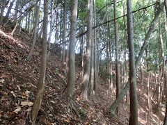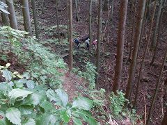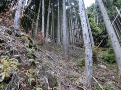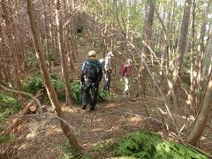 岳ノ山から大鳥屋山に向かうには直進せず90度左の急斜面を降って行く(間違い易い所で注意)ロープなど全くないので確実に下って行く。再び展望のない植林帯の中の緩やかな降りとなる。