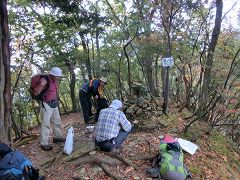 倒木帯を抜けた所で小休止後、急斜面をジグザグに登り尾根筋に出て左方向に僅かに登ると岳ノ山704mの山頂に到着。周りの樹木で展望は無いが紅葉し始めた中での昼食休憩にする。