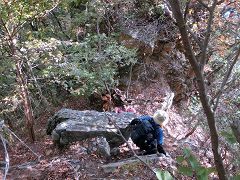 しばらく登って行くと滝の上部に出て滝見の松の案内標識が有り滝を見下ろせるが松の木は枯れて朽ちかけている。沢筋に沿って登って行くと倒木に行くてを阻まれる。