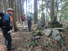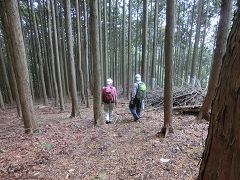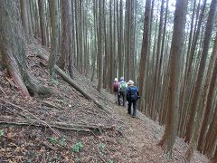 山頂でホットコーヒーなどで休憩後、分岐点まで戻り(降り)北東方向に降って行く。植林後成長と共に間伐されていないので樹木が密に成りすぎ、床面まで陽光が届かず草花が育たず紅葉も見られない。