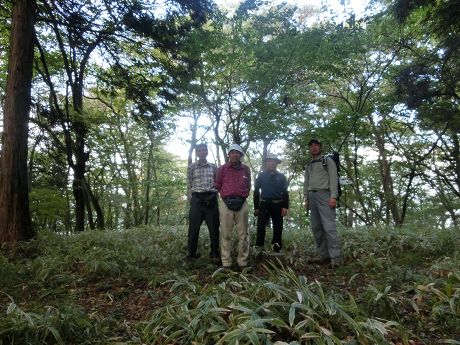 大鳥屋山一頭三角点の位置で記念撮影 |