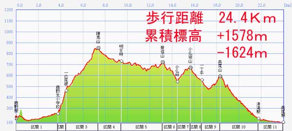 藤野駅8:10→藤野北小学校8:55→一の尾根9:30→陣馬山11:05→明王峠→景信山13:20→小仏城山14:45→一丁平15:10→高尾山16:00→6号路→17:30高尾駅