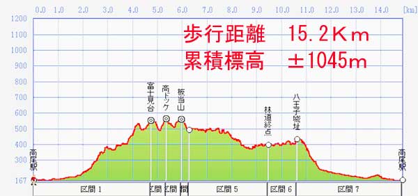 高尾駅→小仏関所裏の跨線橋→富士見台→高ドッケ→板当峠→滝沢林道→八王子城址→高尾駅