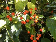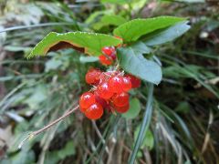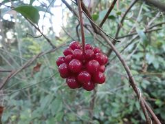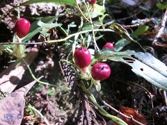 手作りベンチで小休止後、此処から新しく出来た南側の巻路をほぼ平行移動でのんびりと歩いて行く。此の時期は既に花は終わって実になっている物が多く見られる。サネカズラやマルバノホロシの赤い実は特によく目立つ。