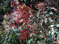 途中に数か所分岐点があるが有志の方が作ってくれた標識が有るので間違いなくコースを辿れる。植林帯の中で展望は無いが至る所で赤い実を付けたナンテンンが多く見られる。目的のテーブルベンチまで来ると先客(MOさん)が昼食中でしばし話をしながらご一緒させて頂く。