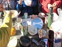 花から実に変化したトキリマメなど撮影しながらススキの穂がキラキラ輝く防火帯の道を登り巻路に入ってくと富士山の展望が得られる。更にキジョランの葉を食べているアサギマダラノ幼虫も見られる。一丁平の展望台から降った所のテーブルベンチで既に鍋会が始まっている。早速鍋会に参加させて頂き青空の下での飲食と歓談に浸る。