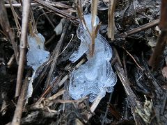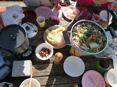 霜華は解け始めていたが数か所で見る事が出来る。後は各人で用意して来た食材などで手際よく雑煮宴会。寒空の下暖かい雑煮と程よいワイン、焼酎、e,t,c しばし時の過ぎるのを忘れての宴となる。