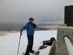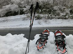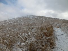 山頂まで一直線に踏み跡の有る雪道を登って行く。両脇には枯草に氷が付いて溶けての繰り返しをした様で色々の形の氷柱(ツララ)が見られる。氷柱の造形の面白さに夢中になり、いつの間にか山頂に到着してしまう。今日は此処でスノーシューを出して今年初のスノーシューハイクを楽しむ。