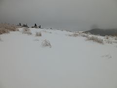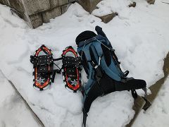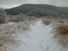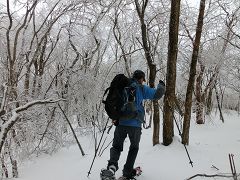 同じ道を戻りたくないので三国峠に降る事にする。幸いに夏路(樹林帯の中)と冬道(草原の路)が並行して見えるので雨氷に阻まれる事が無い冬道を降って行く。積雪の状態は20センチほどの表面が凍っていてその上に2センチほど新しい雪が積もっているので程よいクッションが有りスノーシューで快適に下れる。登山道には登山者の付けた足跡(20センチほどの深さの穴)が続いている。