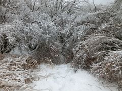 切通峠まで行こうと高指山方面に向かったが何度か雨氷の壁に阻まれて木の枝の隙間を縫う様にして迂回して通過したが途中で引き返す。夏の藪以上に手強い存在だ。帰宅後風呂に入る時足に数か所かすり傷が有り。引き返して正解だった。