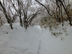 三国峠の直前で冬道と夏路が合流して30センチほどの幅のトレースが有りスノーシューでは歩き難い所だが直ぐに三国峠(神奈川県と山梨県の県境の車道)に出る。スノーシューを外して雨氷の花の並木道を降りパノラマ台を目指す。