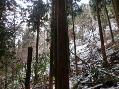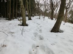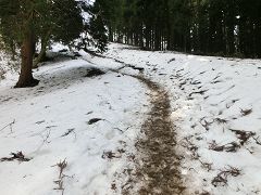 山頂の雪も溶けてきてドロドロの泥濘状態になっている。ゆっくり休憩する雰囲気ではないので小休止後明王峠を目指す。(山友達が明王峠で鍋会を計画)泥濘の登山道を避けて残雪の所を極力歩き、巻路を利用してゆく。目前の泥濘の下りでスリップして泥だらけになった登山者を見て泥濘道を避けて巻路に入って行く。