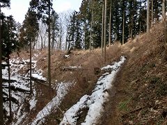 ヤゴ沢から景信山に登る。登り始めの沢沿いの登山道には幾分残雪が見えたが途中の水場を過ぎた辺りからは雪も無く快適に登れる。日の当たらない斜面には未だ多く残雪が多く残っている。