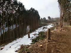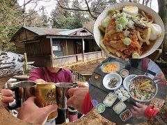 雪の上でのスリップで倒れても雪を払えば済むが、泥濘での転倒は避ける為この後も雪の有る所を選んで歩く。底沢峠手前で様相が一変する。伐採中で非常に明るく気持ちよい尾根道のなる。明王峠に鍋会の方たちより10分ほど早く着いてしまい到着を待っての鍋会となる。