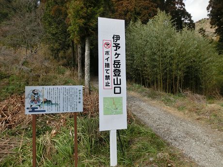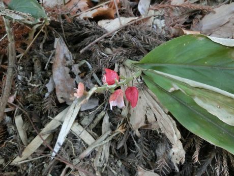 嵯峨山登山口から車で40分ほど走り平群天神裏の駐車場で軽い昼食にしてから聳え立つ伊予が岳に向かう。嵯峨山とは植生が変わってハナミョウガ、フユイチゴ、フウトウカズラ等が見られる山の中をジグザグに登って行く。