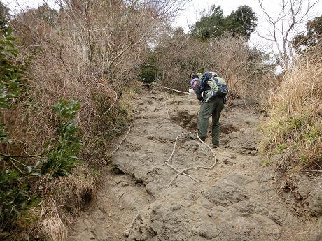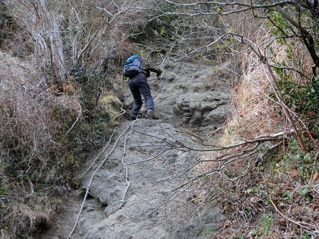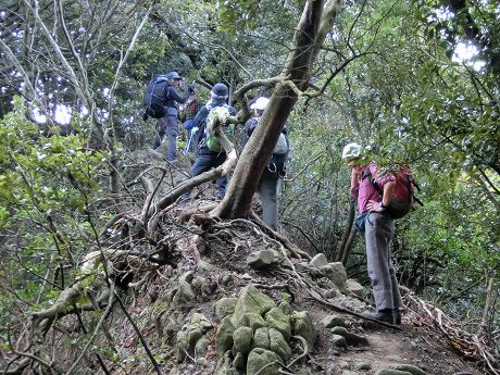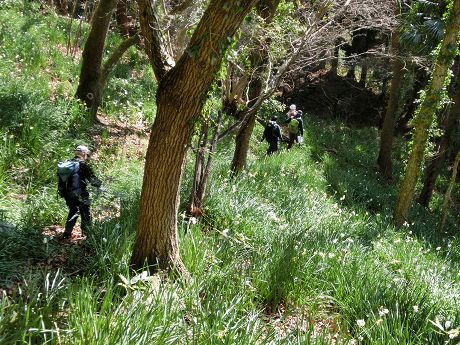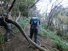樹林帯の中結構きつい斜面を登り、登り詰めると露岩の痩せ尾根となり少々緊張して通過する。足下にはカンアオイや小さなフデリンドウ等結構多く見られるがよそ見は出来ない。痩せ尾根を過ぎた所の斜面までスイセン畑が有り。