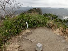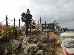 尾根の鼻筋の先端にある休憩舎で先行者たちと合流。此処で一息入れた後は標高差50m程を数本のロープを頼りに岩肌の斜面を登り詰めて標高336mの伊予が岳山頂に出る。山頂で小休止後北峰まで往復する。