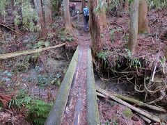 丸太の橋を慎重に渡る |