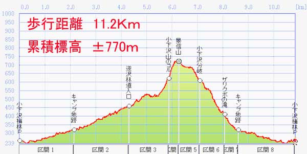 小下沢梅林P→小下沢林道→逆沢林道→景信山→景信山巻道→小下沢分岐→ザリクボの滝→小下沢林道→小下沢梅林P
