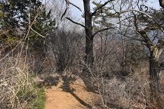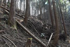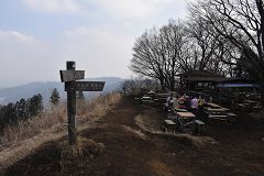 逆沢林道終点手前の沢筋を登って行き景信山と小下沢山の間のコルの直前で踏み跡が解らなくなりコルまで直登する。此の時期は遮る物が無く頭上の目標のコルまで見渡せるので安心して登れるが体力の問題はあり。景信山山が近いので山頂に登り昼食(鍋料理)を楽しんでいる先行の5名とお逢いする。