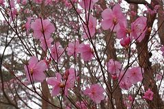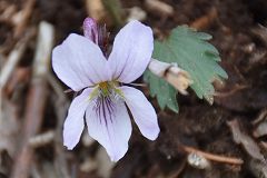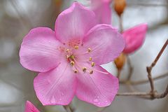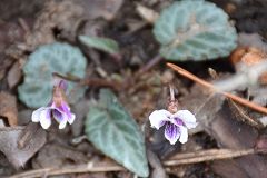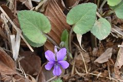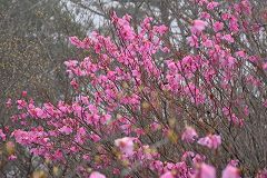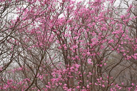 林床は枯葉の絨緞で緑が殆ど無くマイズルソウ、ショウジョウバカマ等の小さな芽が出始めている。スミレ類も葉は各所で見られるが花が着いている物は殆ど無し。しかしヤシオツツジが丁度満開で中腹から山頂まで大歓迎を受ける。見事な咲き具合に大変満足する。