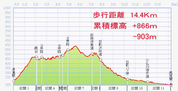 高尾山口駅→1、2、3号路→6号路→稲荷山コース→5号路→紅葉台南巻道→萩原作業道→日影沢林道→小仏川遊歩道→高尾駅